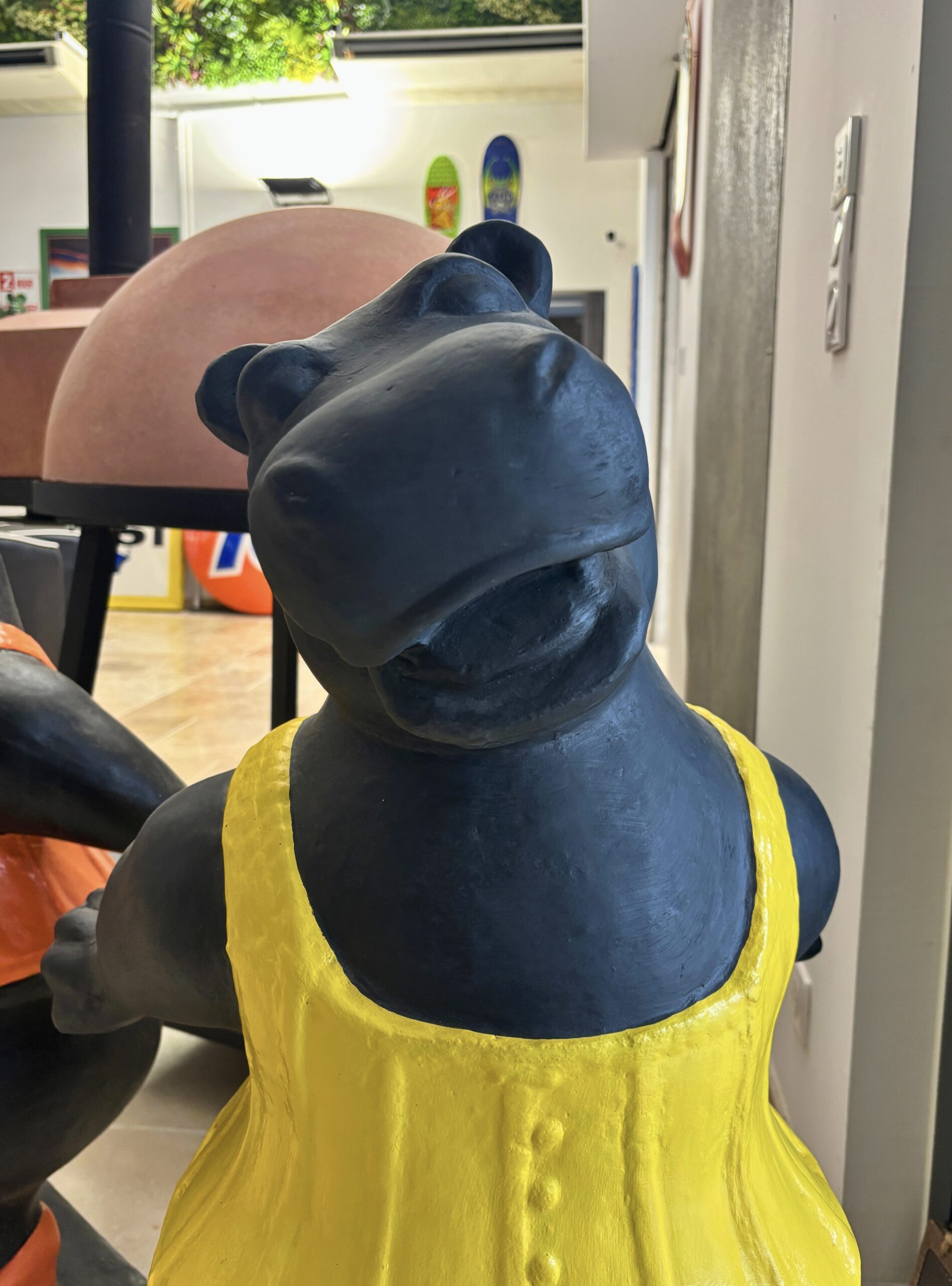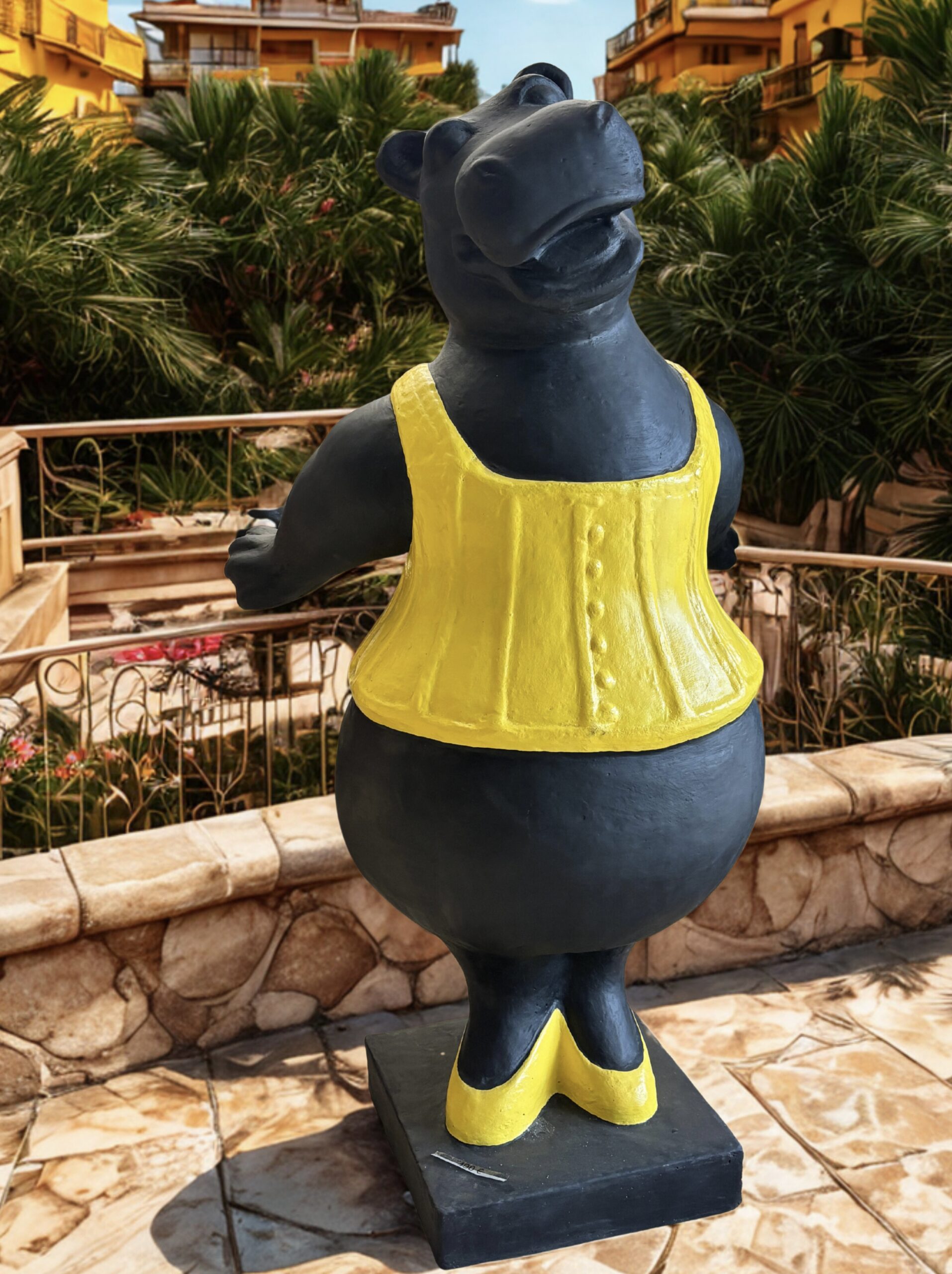 Sculpture décorative en forme d’hippopotame, tenue jaune et chaussures assorties.
