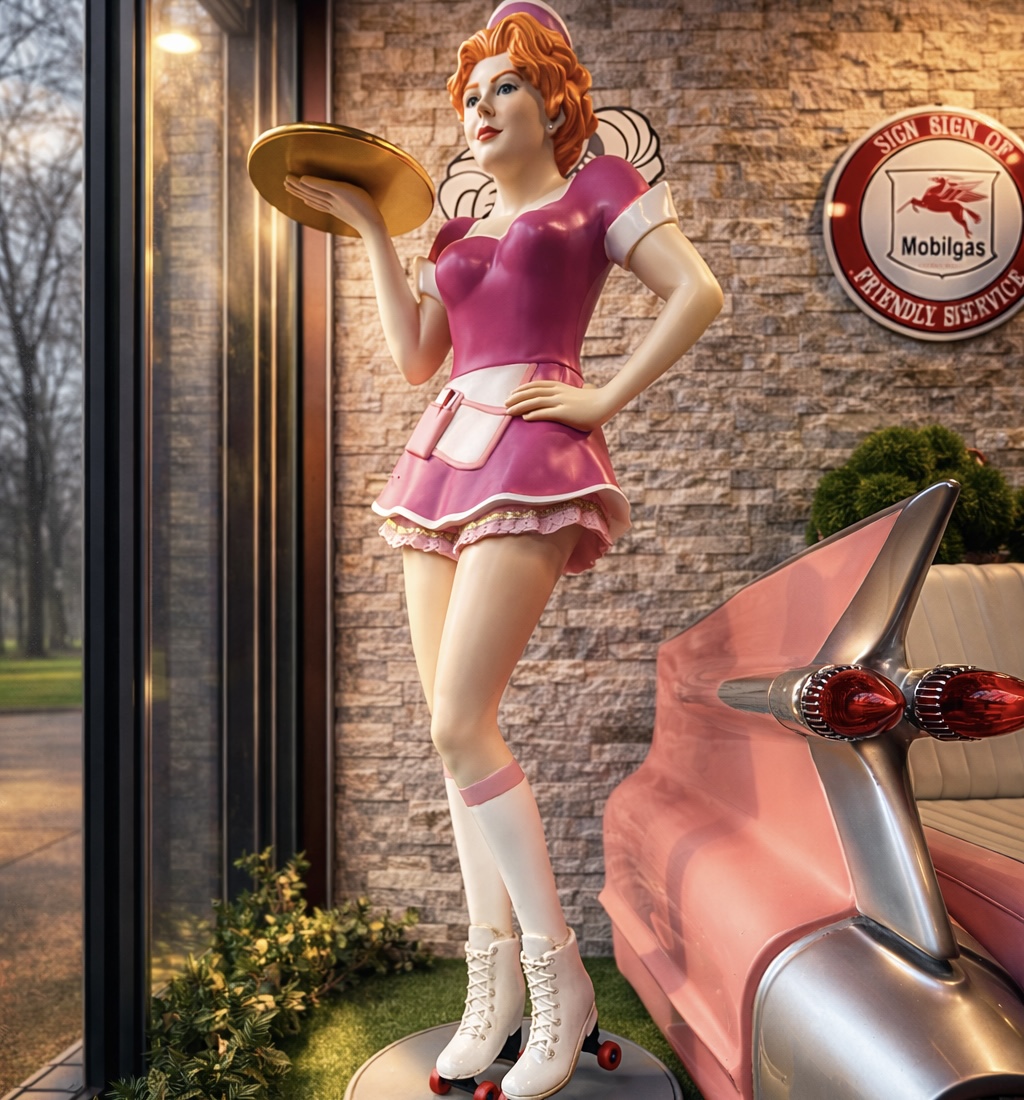 Notre serveuse en patins à roulettes mesure 1,70 m de hauteur.